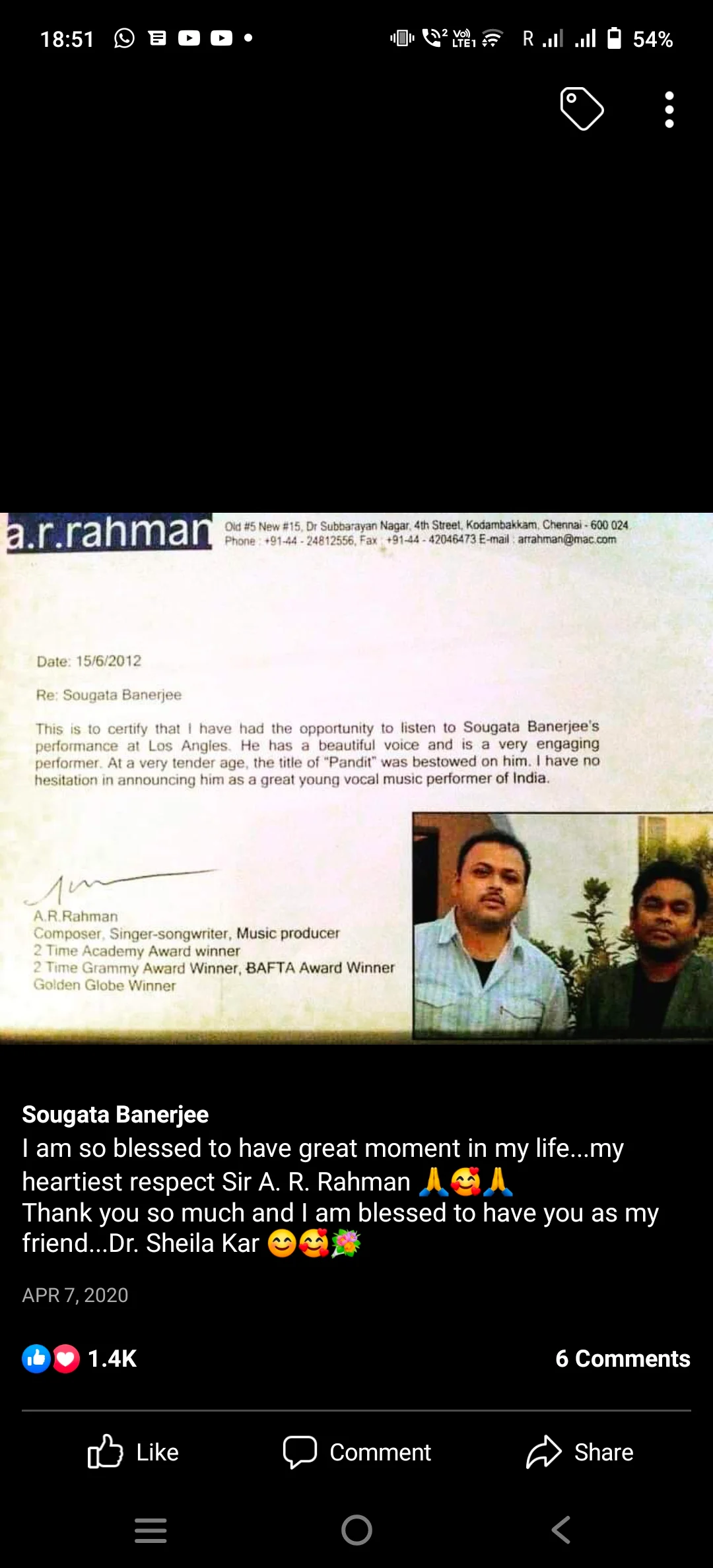 He was fortunate to perform in front of Pt. Ravi Shankar Ji in US, and was delighted to meet him and know about his grandfather who was the doyen of Bishnupur Gharana. And at the end of the concert Pt Ravi Shankarji exclaimed by saying "Aaj Ka Shaam Ban Gaya".